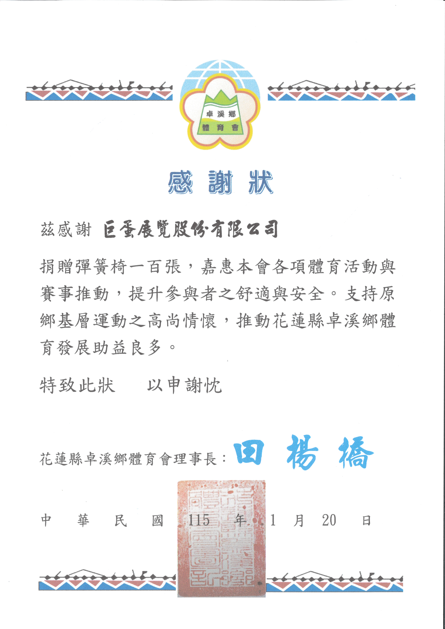 花蓮縣卓溪鄉體育會感謝狀