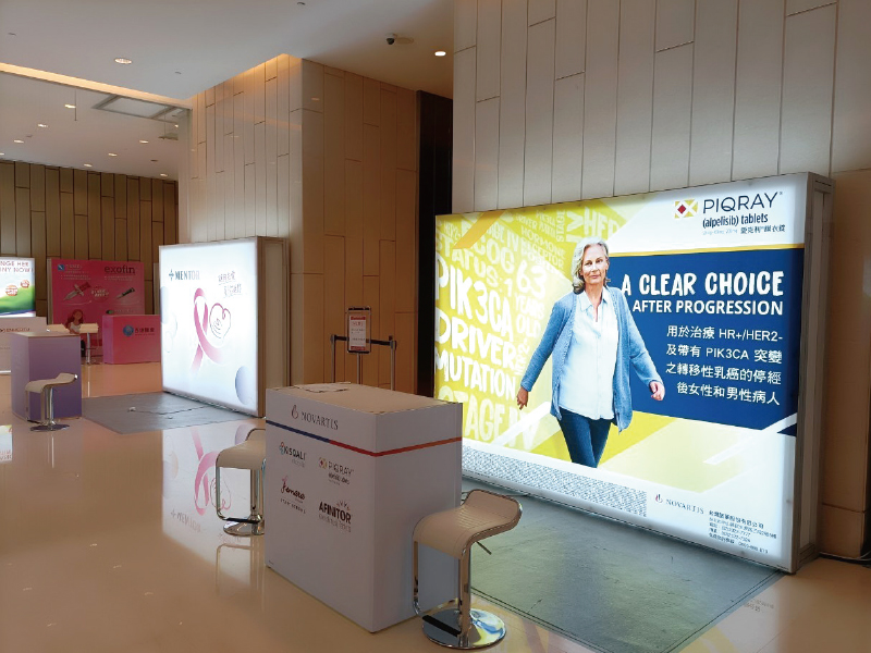 結合燈箱與方柱結構,打造平整明亮的活動背景牆,適合品牌廣告與主題視覺呈現。